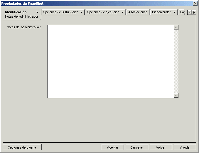 Esta página de propiedades (la cual se muestra a continuación) permite registrar notas para uno mismo o para otros administradores. Por ejemplo, puede utilizarlas como recordatorio de los ajustes especiales de una aplicación. O bien, si tiene varios administradores, puede escribir un historial de las actualizaciones y los cambios realizados en los archivos.