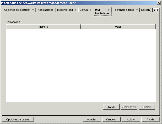 La página Propiedades, que aparece a continuación, permite sustituir los valores de propiedades públicas que contiene el paquete MSI y añadir nuevas propiedades públicas.