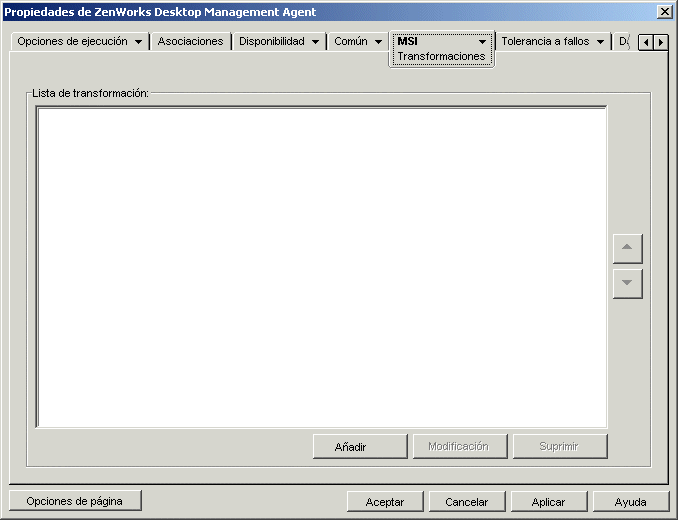 La página de propiedades Transformaciones (la cual se muestra a continuación) incluye las transformaciones que aplica Microsoft Windows Installer al paquete MSI durante la distribución. Las transformaciones añaden, suprimen o cambian las propiedades del paquete MSI para permitir personalizar la instalación para distintos grupos de usuarios.