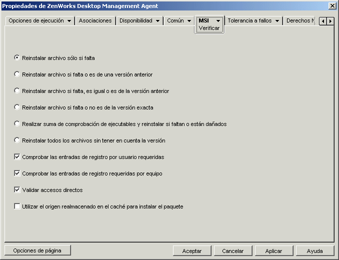 La página de propiedades Verificar, que aparece a continuación, determina las acciones que el instalador de Microsoft Windows lleva a cabo para verificar la aplicación.