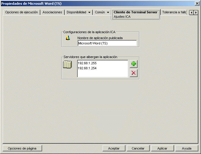 La pestaña Cliente de Terminal Server incluye una de las siguientes páginas, según sea el protocolo de cliente de la aplicación Objeto que se haya definido (ICA o RDP):