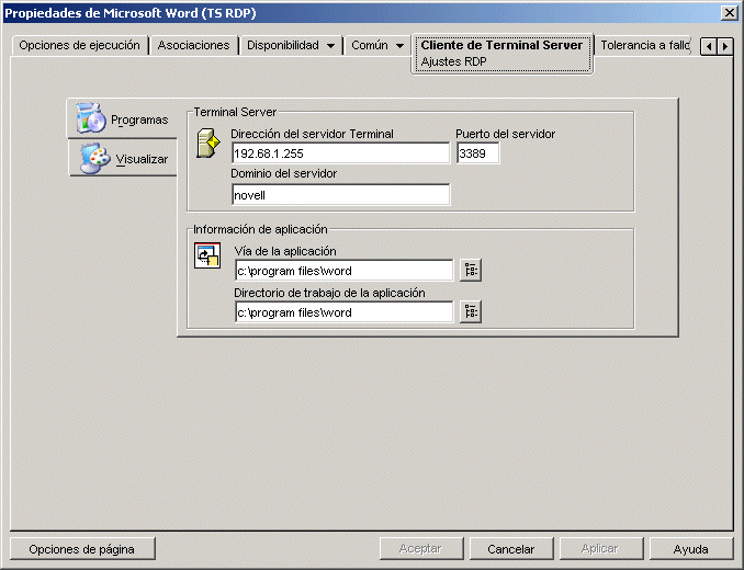 Esta página de propiedades permite configurar los ajustes que utiliza el cliente RDP al lanzar la aplicación desde Windows Terminal Server.