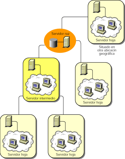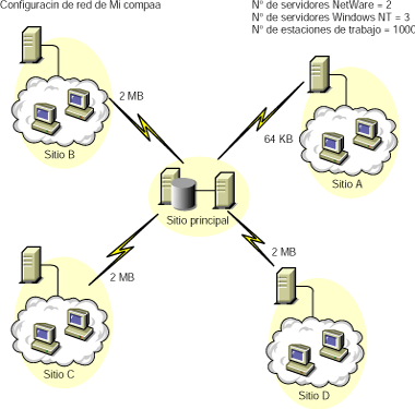 La ilustración siguiente muestra la organización de la red de una empresa con servidores en distintos emplazamientos.