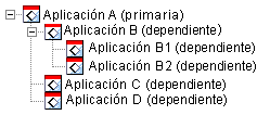 En este ejemplo, la Aplicación B es una de las aplicaciones dependientes de la Aplicación A. A su vez, la Aplicación B tiene dos aplicaciones dependientes, la Aplicación B1 y la Aplicación B2.