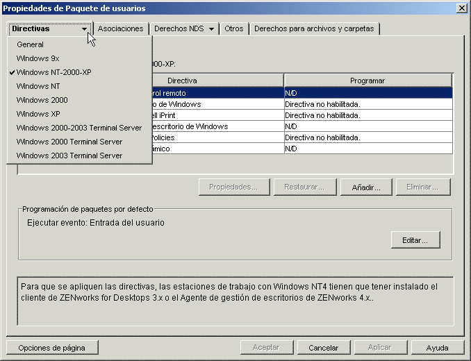 Muestra las directivas disponibles para equipos con Windows NT/2000/XP. Utilice esta página si no desea tratar los equipos con Windows NT/2000/XP como plataformas independientes. También puede usarla para definir directivas para usuarios y estaciones de trabajo que empleen versiones anteriores de ZENworks for Desktops. Si está utilizando Cliente Novell® sin el Agente de gestión de escritorios, debe configurar y habilitar directivas en esta página en lugar de hacerlo en las páginas de cada plataforma, citadas más abajo (Windows NT, Windows 2000 o Windows XP). Si actualiza a partir de una versión anterior de ZENworks for Desktops, las directivas existentes se enumeran en esta página de plataforma. Las nuevas páginas de plataformas que separan las plataformas Windows NT/2000/XP en páginas de plataformas individuales eran mejoras de ZENworks for Desktops 4. Puede continuar gestionando las directivas desde una versión anterior de ZENworks for Desktops en esta página o configurar y habilitar nuevas directivas para aplicarlas a plataformas individuales mediante una de las páginas de plataformas específicas que aparecen a continuación. Para obtener más información sobre la compatibilidad de Desktop Management con la plataforma Windows NT, consulte |