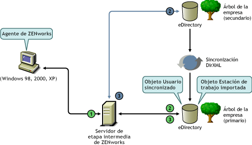 Si tiene un árbol de la empresa en eDirectory, puede autenticarse en un árbol de ZENworks independiente (con objetos Usuario sincronizados con el árbol de la empresa) si elige utilizar el Cliente Novell o el Agente de gestión de ZENworks en combinación con el Servidor de etapa intermedia de ZENworks.