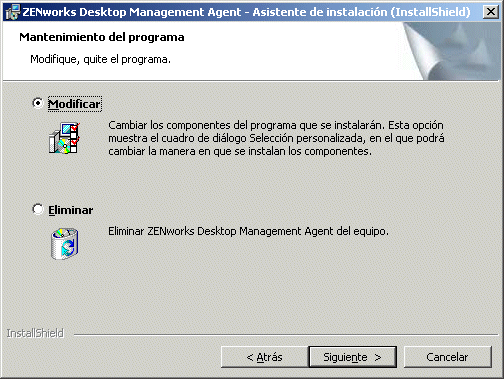 Modificación: seleccione esta opción para acceder a la página de selección de funciones. En esa página, puede añadir o suprimir las funciones que desee incluir con la instalación del Agente de gestión de escritorios.