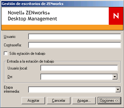 Este recuadro de diálogo de entrada requiere que el usuario introduzca un ID de usuario y una contraseña (es decir, las “credenciales de autenticación”) para el Servidor de gestión de escritorios. Éstas son las mismas credenciales que el usuario está acostumbrado a utilizar para conectarse con la red (es decir, conectarse a eDirectory).