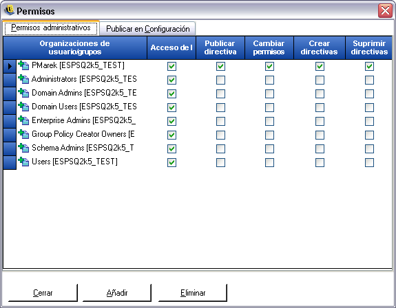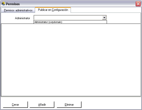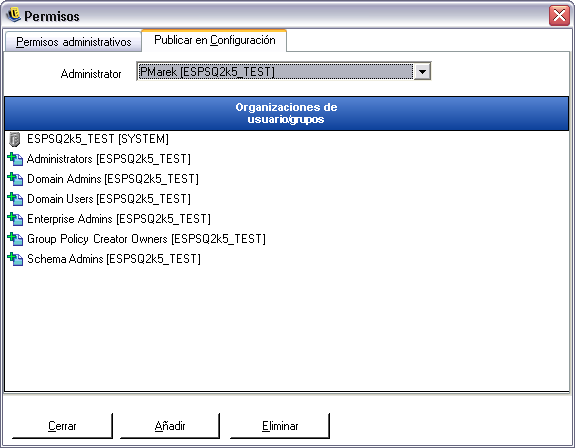 Los parámetros de configuración de los permisos definen el usuario o grupo de usuarios a los que se les permite acceso a la consola de gestión, permisos administrativos o parámetros de configuración de la publicación.