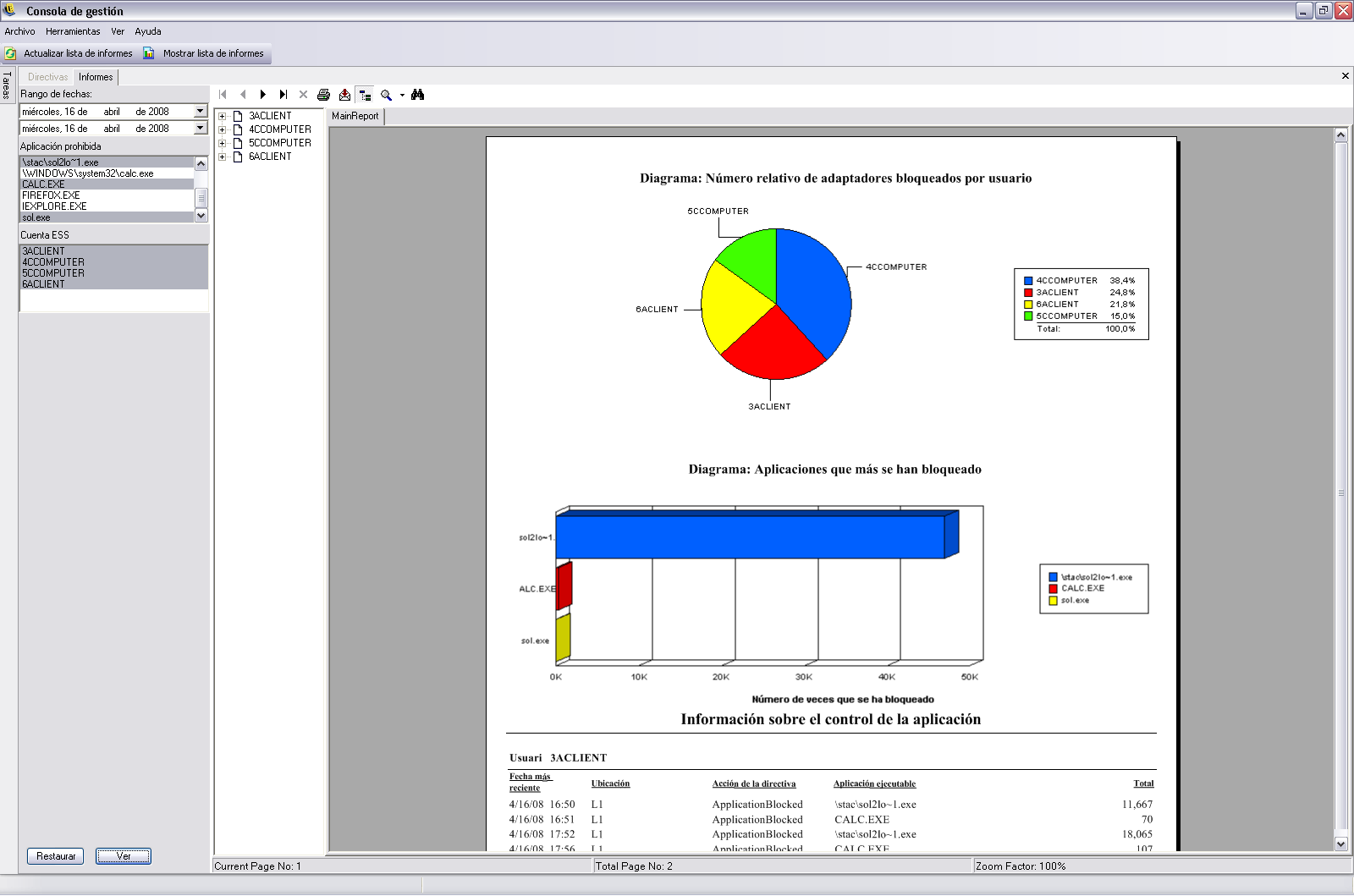Especifique los parámetros de fecha, seleccione en la lista los nombres de la aplicación, seleccione las cuentas de usuario y haga clic en para ejecutar el informe.