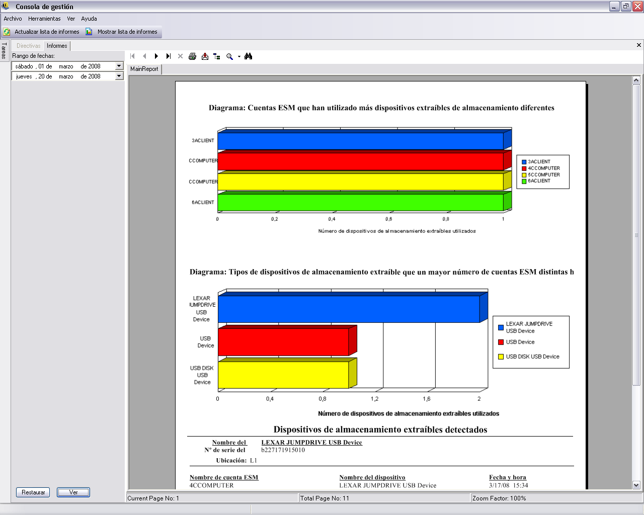 Actividad del almacenamiento extraíble por dispositivo: Muestra los dispositivos de almacenamiento extraíbles a los que se han copiado los archivos. Seleccione el rango de fechas, nombres de usuarios y ubicaciones para generar este informe.