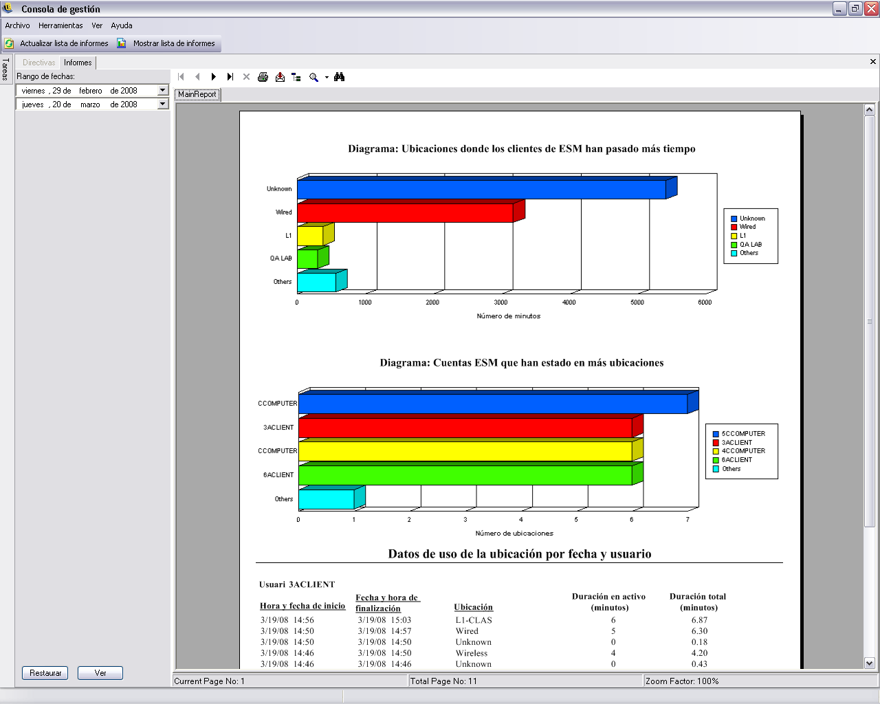 Datos de uso de la ubicación por fecha y usuario: Proporciona información recogida de los clientes individuales acerca de qué ubicaciones se utilizan y cuándo se utilizan. Las fechas se muestran en formato UTC. Las ubicaciones visualizadas son las ubicaciones que utiliza el usuario; las ubicaciones no utilizadas no se visualizan. Seleccione el rango de fechas para generar el informe.