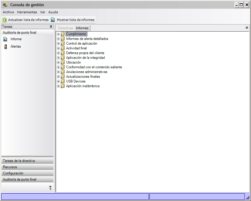 Seleccione de la barra de tareas o del menú . Se visualizará la lista de informes disponibles (para expandir la lista, haga clic en los iconos con el signo más que hay junto a cada tipo de informe).