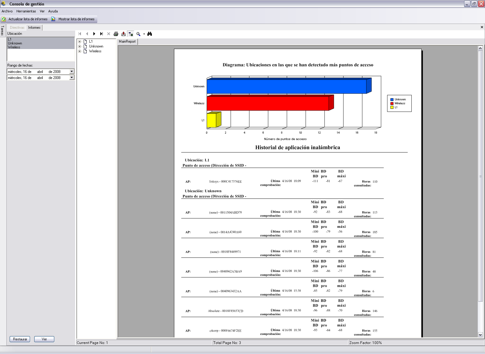Historial del entorno inalámbrico: Proporciona un análisis de todos los puntos de acceso detectados, independientemente de la propiedad. Incluye la frecuencia, la fuerza de la señal y si el punto de acceso está o no cifrado. Las fechas se muestran en formato UTC. Para generar este informe, seleccione las ubicaciones deseadas y el rango de fechas.