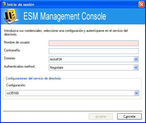 Para entrar en la consola, introduzca el nombre y la contraseña del administrador. Antes de poder introducir el nombre de usuario y la contraseña, debe estar conectado al dominio del servicio de directorio (consulte Sección 7.2.1, Adición de servicios de eDirectory). El nombre de usuario debe hacer referencia a un usuario que se encuentre en el dominio del Servicio de gestión.