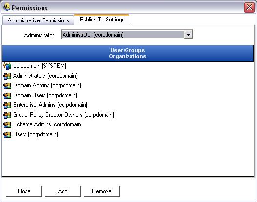 Los parámetros de configuración de los permisos definen el usuario o el grupo de usuarios que tiene permiso de acceso a la consola de gestión para publicar directivas y cambiar estos parámetros.