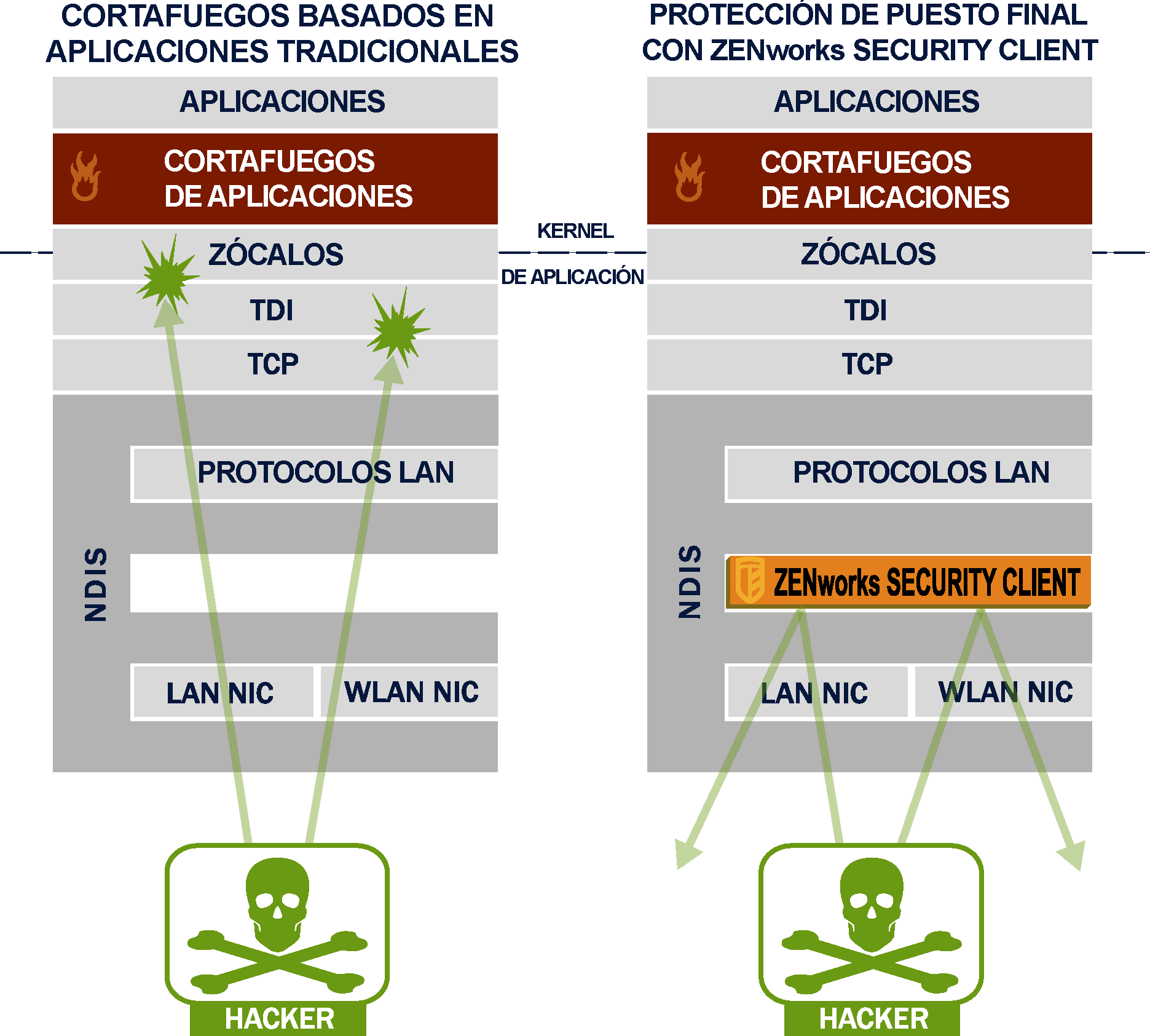 En los dispositivos móviles de seguridad, ESM es superior a las típicas tecnologías personales de cortafuegos, que funcionan sólo a nivel de aplicación o como dispositivos de gancho de cortafuegos. La seguridad de los clientes ESM se integra en el controlador NDIS (Network Driver Interface Specification, Especificación de la Interfaz del controlador de Red) de las tarjetas de interfaz de red (NIC), lo que protege al tráfico desde el momento en que entra en el equipo. Las diferencias entre ESM y los cortafuegos del nivel de aplicación y los controladores de filtro se ilustran en Figura 1-2, Eficacia del cortafuegos de un nivel de NDIS.