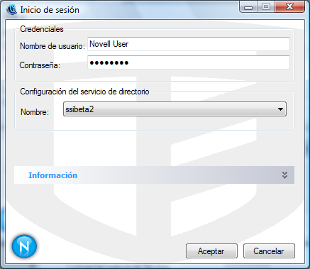 Introduzca su nombre de usuario y contraseña para el dominio o para el árbol eDirectory y, a continuación, haga clic en .
