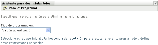 El Asistente para desinstalar lotes permite decidir si se debe desinstalar o no el software en los dispositivos asignados anteriormente. Si indica que desea eliminar el software, podrá especificar una programación para desinstalar el software.