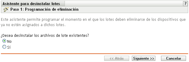 Utilice el Asistente para desinstalar lotes para programar el momento en que el software que contiene un lote debe desinstalarse de los dispositivos que ya no estén asignados al lote.