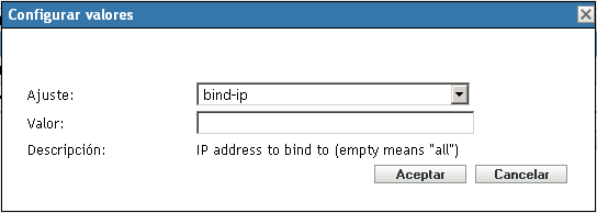 Valor: si el valor de configuración seleccionado requiere valores específicos, seleccione el valor que desee en la lista desplegable. Si el valor de configuración seleccionado no requiere valores específicos, escriba el valor en el recuadro Valor.