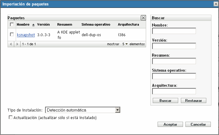 Detección automática: detecta automáticamente si el lote está ya instalado en los dispositivos asignados y, si es necesario, instala el lote o actualiza el lote existente. La opción determina qué función es mejor aplicar, o (ambas se explican más adelante), y después realiza la operación correspondiente. Los paquetes de kernel se instalan mediante la función el resto de los paquetes se instalan con la función Esta es la opción por defecto, que será la adecuada en la mayoría de las ocasiones.