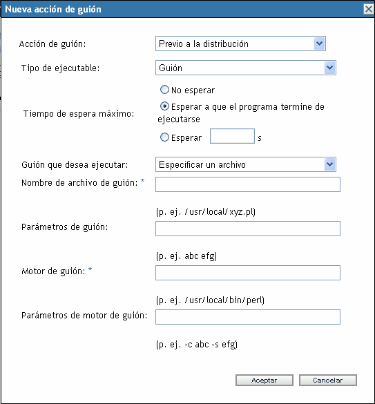 Nombre de archivo de guión: (obligatorio) especifique la vía al archivo de guión en el dispositivo de destino, por ejemplo, /usr/local/xyz.pl.