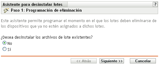 Utilice el Asistente para desinstalar lotes para programar el momento en que el software que contiene un lote debe desinstalarse de los dispositivos que ya no estén asignados al lote.