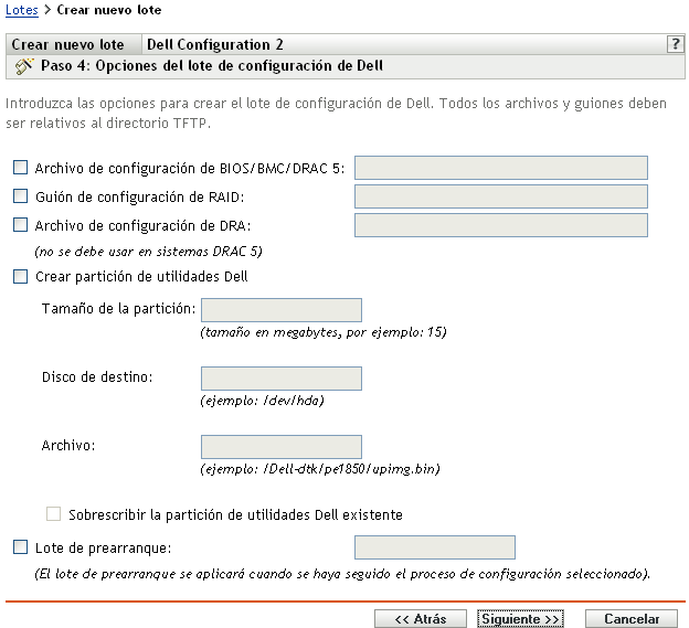 Haga clic en para mostrar la página Opciones del lote de configuración de Dell: