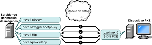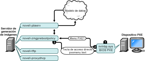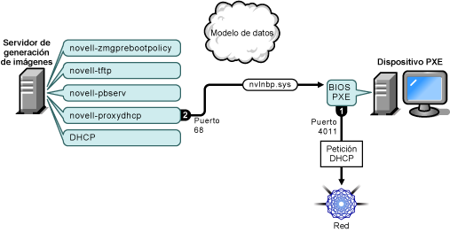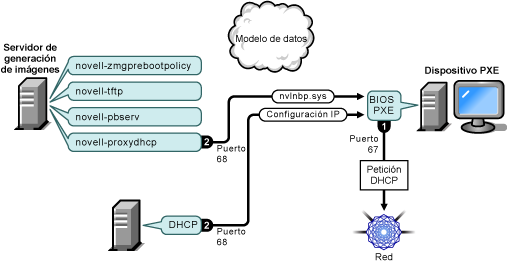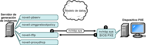 El daemon novell-proxydhcp responde con las direcciones IP del servidor TFTP, así como el nombre de archivo del programa de bootstrap de los servicios de prearranque (nvlnbp.sys).