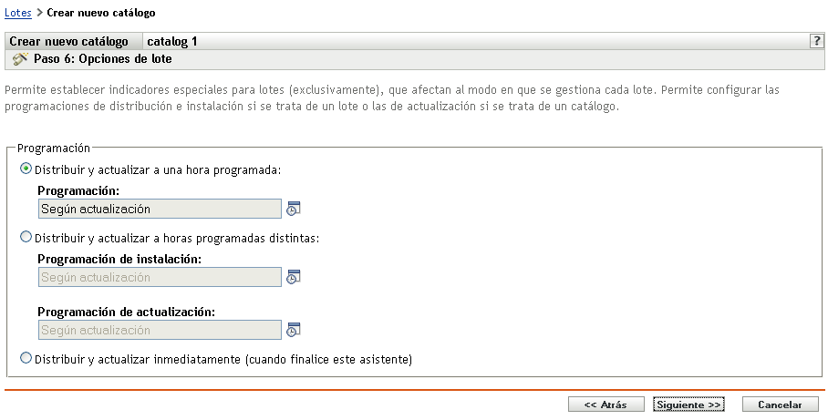 Distribuir y actualizar a una hora programada: use esta opción para programar la distribución e instalación de lotes incluidos en este grupo de lotes. Haga clic en el icono para elegir el tipo de programación.