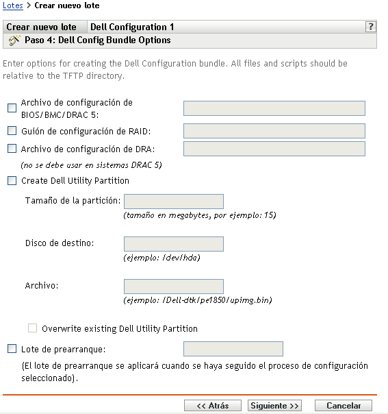 En el momento de crear un lote de configuración de Dell es posible que necesite disponer de guiones o archivos especializados creados previamente, en función de la configuración que use en el lote. Novell recomienda que se sigan las instrucciones que figuren en la documentación de Dell DTK para crear los guiones y los archivos de configuración necesarios.
