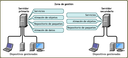 Una zona de gestión de ZENworks consta de un servidor primario de ZENworks y uno o varios dispositivos gestionados. Además, la zona de gestión puede incluir uno o varios servidores secundarios de ZENworks, si es necesario. Los servidores de ZENworks de cada zona colaboran para gestionar los dispositivos de ésta.
