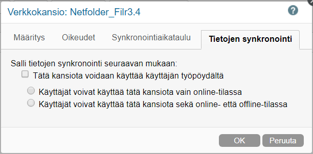 Tietojen synkronointi -välilehdellä poista valinta kohdasta Tätä kansiota voidaan käyttää käyttäjän työpöydältä.