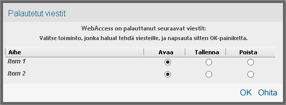 Valitse Ohita, jos haluat säilyttää tallennetut viestit levyllä mutta et halua palauttaa niitä WebAccessiin. Kun käynnistät WebAccessin seuraavan kerran, automaattisen tallennuksen ikkuna avautuu uudelleen.