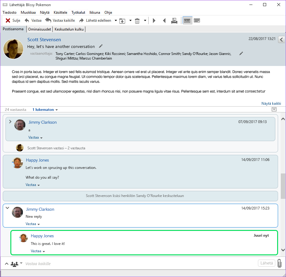 Keskustelun uusilla vastauksilla on vihreä reunus. Ne pysyvät vihreinä 3 minuutin ajan viestin lukemisen jälkeen. Voit poistaa lukemattomat viestit Viestiluettelon kohteesta napsauttamalla hiiren kakkospainikkeella viestin vieressä olevaa vihreää numeroa, joka näyttää lukemattomien viestien määrän.