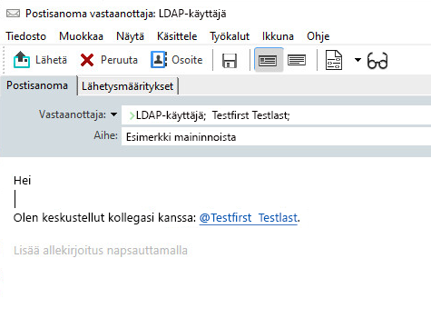 Maininnat-toiminnolla voit käyttää osoitekirjan nimentäydennystä lähetettävien viestien leipätekstissä. Näin voit lisätä vastaanottajia nopeasti Vastaanottaja-kenttään ja kiinnittää huomion näihin vastaanottajiin suoraan viestin tekstissä linkitetyllä, korostetulla nimellä, joka lisätään viestiin.