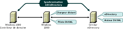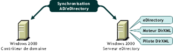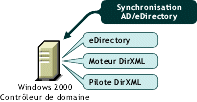 Un contrôleur de domaine Windows 2000 unique héberge eDirectory, le moteur DirXML et le pilote.