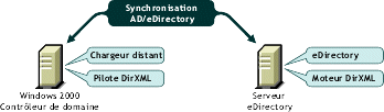 Il existe deux méthodes d'installation des configurations à double serveur. Dans le cadre de la première configuration, eDirectory, le moteur DirXML et le pilote sont installés sur un ordinateur différent de celui sur lequel se trouve le contrôleur de domaine Active Directory. Figure 2