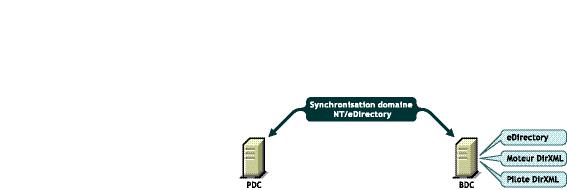 Cette configuration est optimale pour la vitesse de traitement du fait que tous les composants sont installés sur le même ordinateur. De plus, elle permet au pilote DirXML d'accéder directement au PDC. À partir de cet emplacement, le pilote est en mesure de gérer tous les scénarios de récupération indépendamment des contraintes liées à la connexion et aux API.