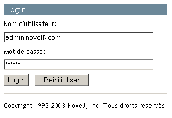 IMPORTANT : si votre arborescence comporte des conteneurs dont les noms utilisent des points, vous devez faire précéder ces points d'une barre oblique inverse lorsque vous vous loguez à des utilitaires comme iMonitor, iManager et DHost iConsole. Par exemple, si le nom du paramètre O dans votre arborescence correspond à « novell.com », entrez nom_utilisateur.novell\.com dans le champ Nom d'utilisateur pour vous loguer à iMonitor (voir Figure 1).