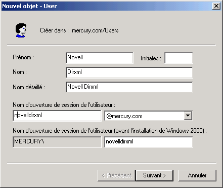Enregistrez le nom de login ainsi que le domaine dans le tableau sous Collecte d'informations de configuration. Par exemple, enregistrez novelldirxml@mercury.com. Cette information vous sera demandée ultérieurement au cours de la configuration des paramètres du pilote.