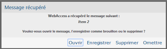 Omettre : conserve les messages enregistrés sur le disque, mais ne les récupère pas dans WebAccess. Lorsque vous démarrez WebAccess la fois suivante, la fenêtre d'enregistrement automatique s'affiche.