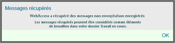 Lorsque vous composez un nouveau message dans GroupWise WebAccess, les éléments sont enregistrés automatiquement. Cela évite de perdre les messages en cours de création si WebAccess se ferme inopinément. Lorsque vous redémarrez WebAccess, vous avez la possibilité de récupérer ces messages pour terminer de les composer.