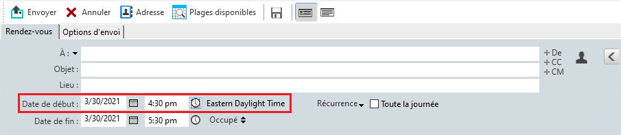 Par exemple, si vous planifiez un rendez-vous à 16 h 30, heure de l'Est des États-Unis, et que vous vous trouvez dans le fuseau horaire du Pacifique, il apparaît dans votre agenda à 13 h 30, heure du Pacifique. Le fuseau horaire est désormais affiché dans l'en-tête du rendez-vous en regard de l'heure de début :