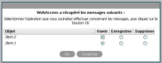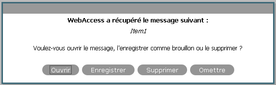 Omettre : conserve les messages enregistrés sur le disque, mais ne les récupère pas dans WebAccess. Lorsque vous démarrez WebAccess la fois suivante, la fenêtre d'enregistrement automatique s'affiche.