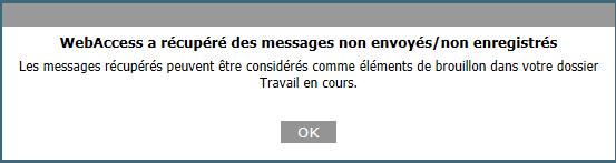 Lorsque vous composez un nouveau message dans GroupWise WebAccess, les éléments sont enregistrés automatiquement. Cela évite de perdre les messages en cours de création si WebAccess se ferme inopinément. Lorsque vous redémarrez WebAccess, vous avez la possibilité de récupérer ces messages pour terminer de les composer.