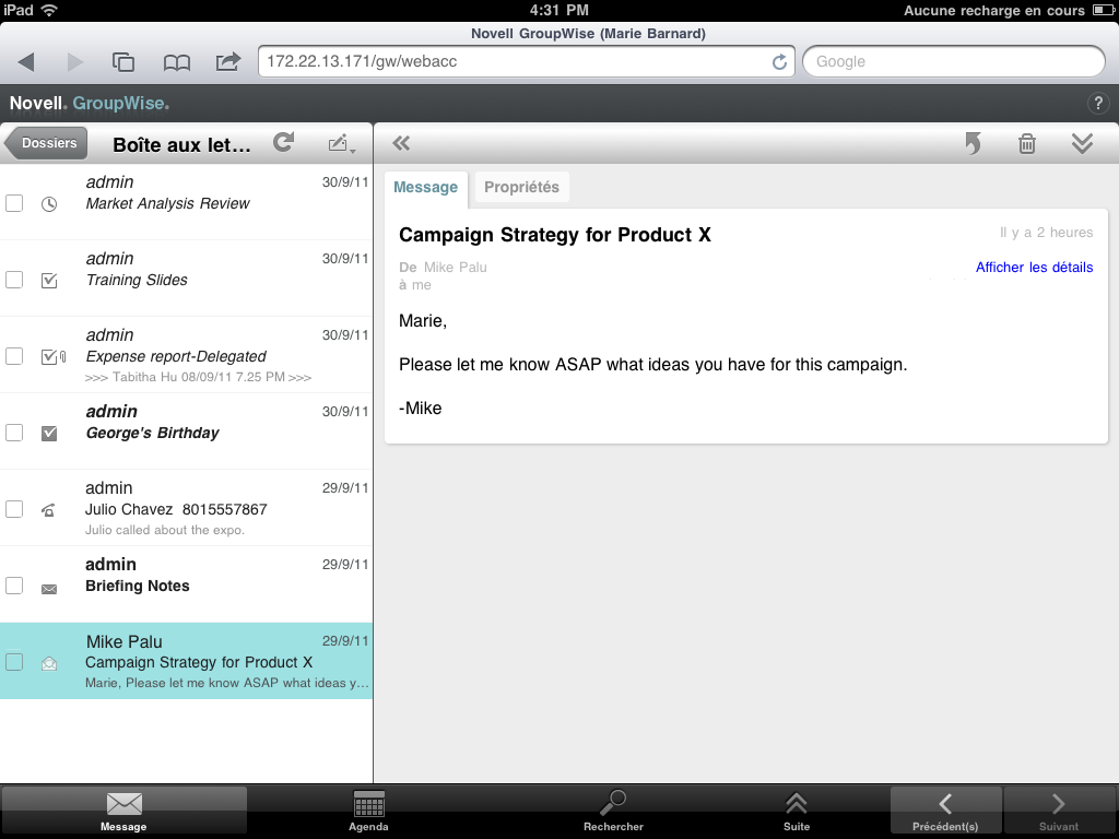 La boîte aux lettres contient l'ensemble des messages électroniques que vous avez reçus et permet également d'envoyer de nouveaux messages. Par ailleurs, vous pouvez y consulter vos rendez-vous, tâches et notes tant que vous ne les avez pas acceptés (une fois acceptés, ils ne figurent plus que dans votre agenda).