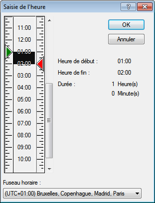 Utilisez la flèche verte pour sélectionner l'heure de début et la flèche rouge pour sélectionner l'heure de fin. Les heures sélectionnées apparaissent à droite sur l'écran. Vous pouvez utiliser des intervalles de 15 minutes minimum.