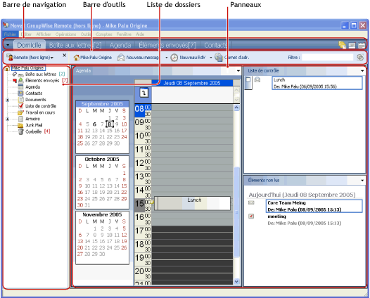 Dans GroupWise, la zone de travail principale est appelée « fenêtre principale ». À partir de la fenêtre principale de GroupWise, vous pouvez lire vos messages, planifier vos rendez-vous, afficher votre Agenda, gérer les contacts, modifier le mode d'exécution de GroupWise, ouvrir des dossiers ou des documents, etc.